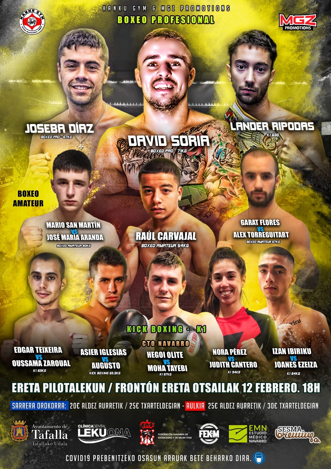 El próximo sábado, 12 de febrero, el frontón Ereta de Tafalla albergará una completa velada de boxeo profesional, amateur y kick boxing K1.